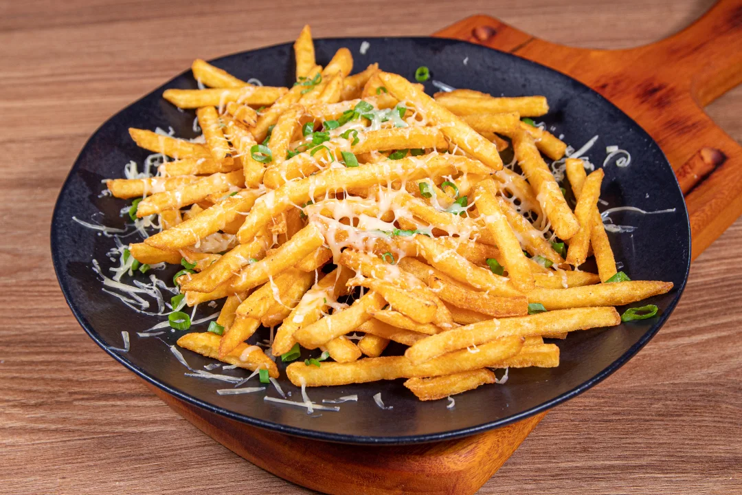 Batatas fritas super crocantes com páprica, parmesão e cebolinha. Acompanha molho aioli com ervas.